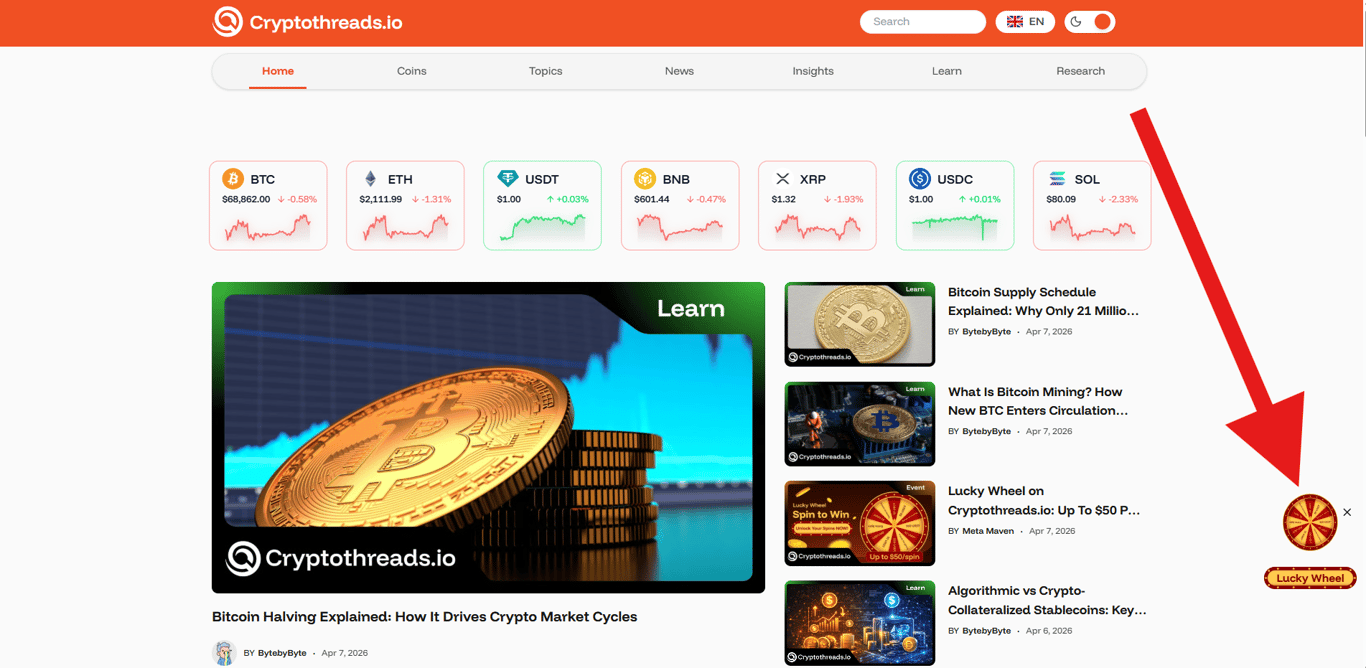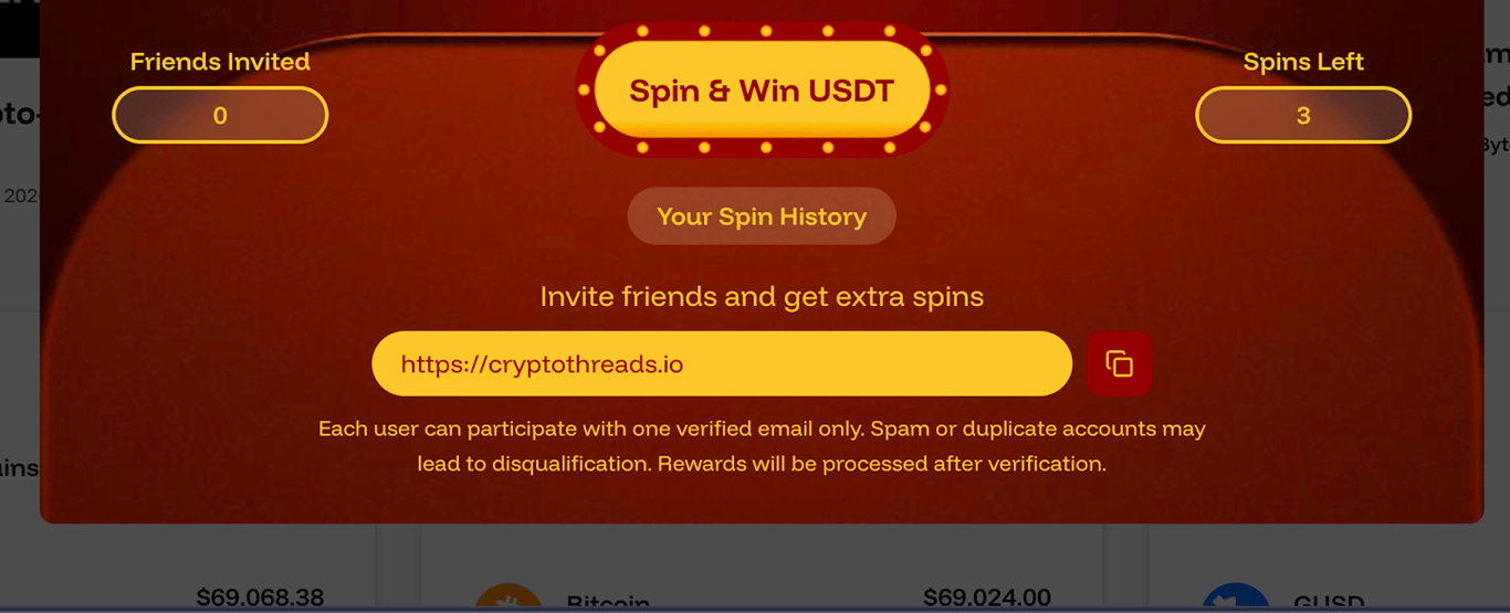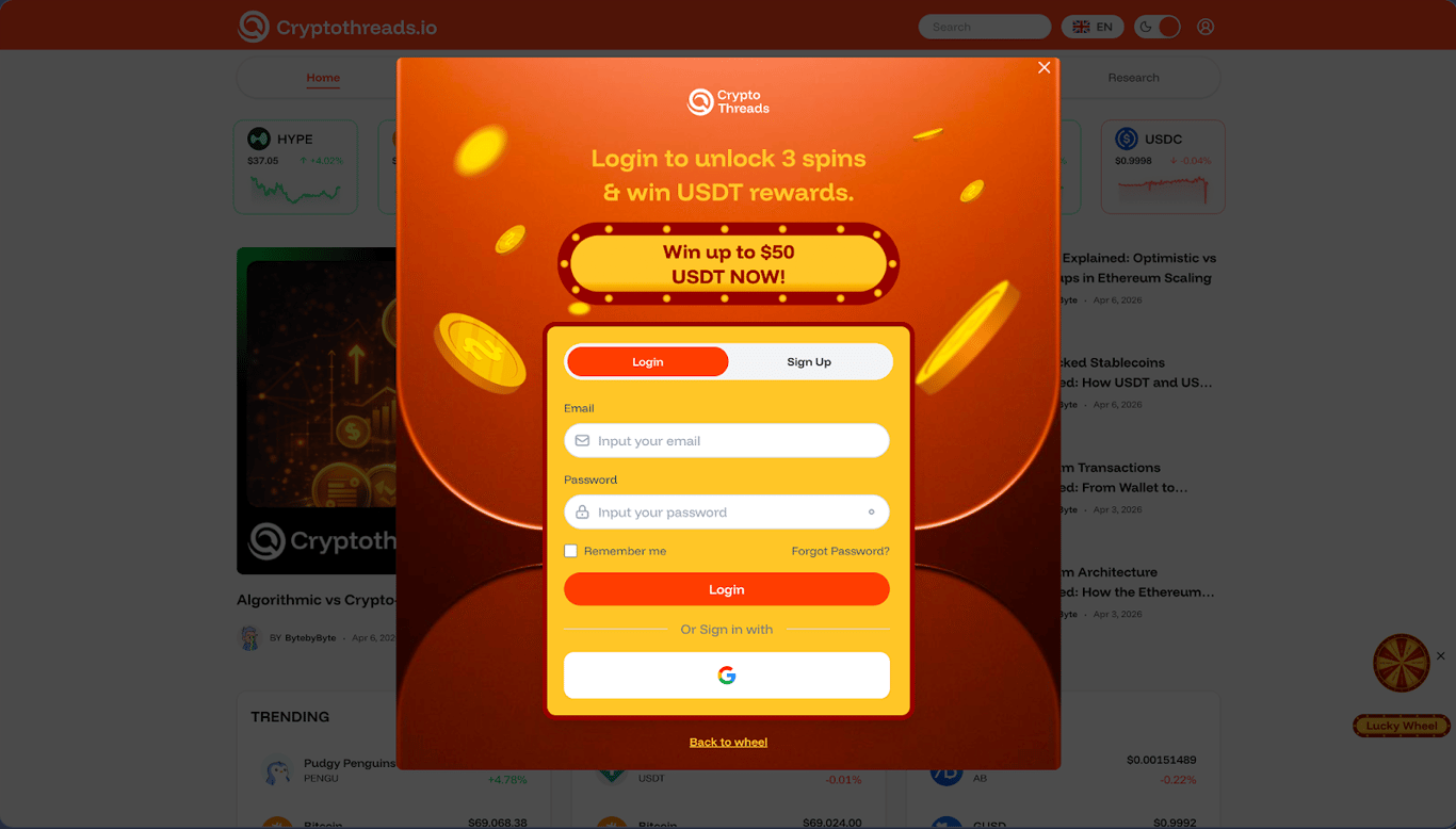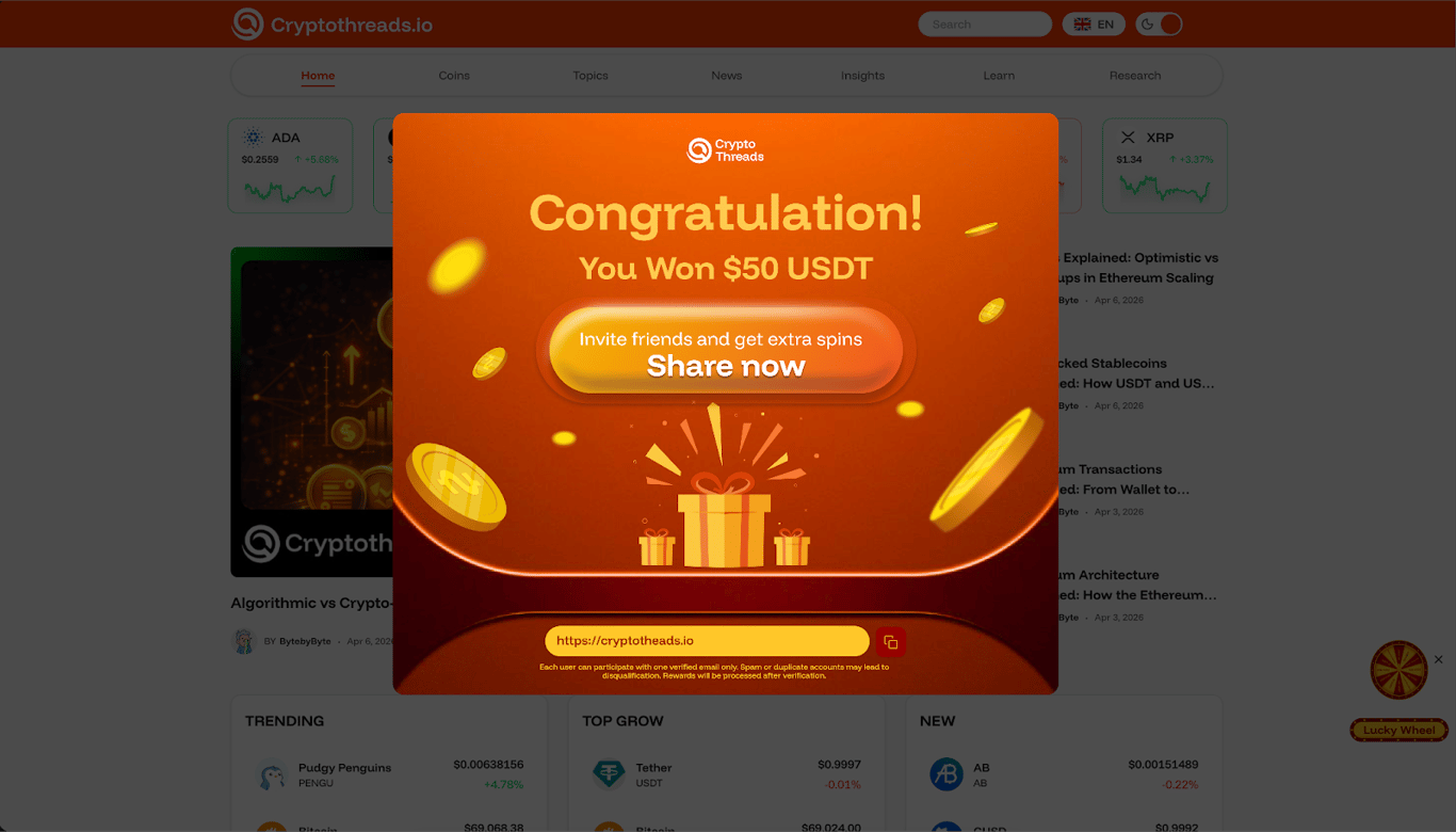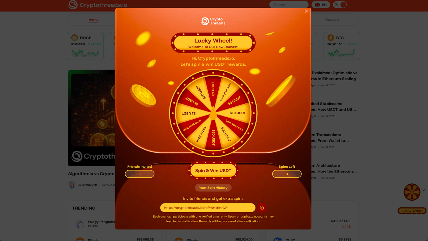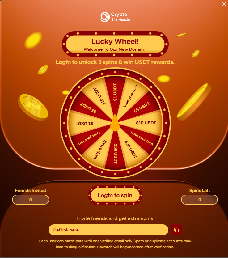 Cryptothreads.io launches the Lucky Wheel campaign alongside its new domain, giving users a direct chance to win real USDT rewards from the moment they join. Just a few simple steps unlock spins, and each spin carries real chances of winning up to $50 per spin.
